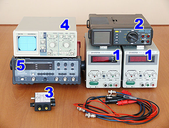 Внешний вид установки можно увидеть на рис. 1. В её состав входят: источники питания 1, многопредельный миллиамперметр 2, измерительный модуль 3, осциллограф 4 и генератор сигналов 5.
