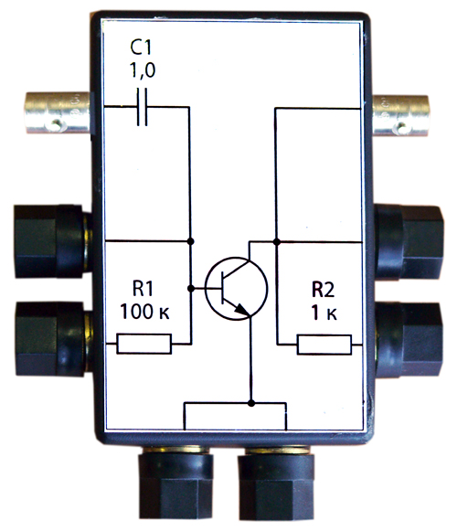 Исследуемый транзистор и несколько пассивных элементов помещены в диэлектрический бокс, обеспечивающий защиту элементов схемы от внешних факторов и защищающий экспериментаторов от неблагоприятных воздействий (рис 2). Для подсоединения питающих напряжений и измерительных приборов на корпусе модуля имеются клеммы и ВЧ разъёмы.