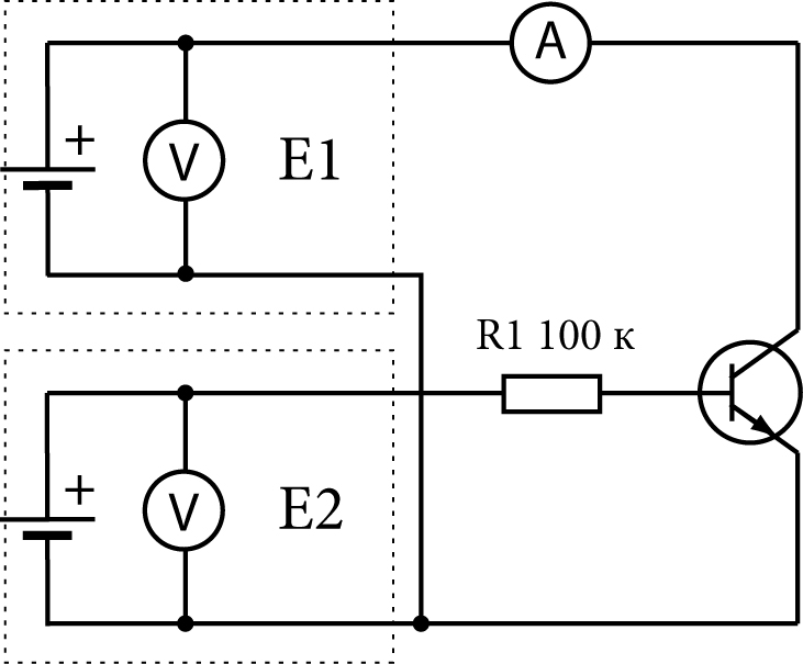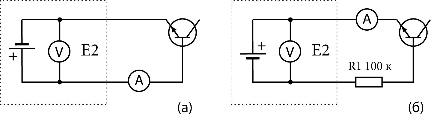 Измерение обратной характеристики перехода база-эмиттер производится по схеме, изображённой на рис. 3(б).