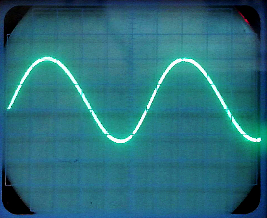 Установите линейный режим работы транзистора: напряжение Е1 = 6 В, ток базы (меняется изменением Е2) примерно 50...150 мкА, при этом ток коллектора должен быть в районе 3 мА, напряжение на коллекторе около 3 В. Подайте с генератора сигналов синусоидальный сигнал частотой 10...20 кГц, напряжением 10...20 мВ. Получите на осциллографе выходной сигнал. Скорректируйте положение рабочей точки и уровень входного сигнала для достижения минимальных искажений выходного сигнала (рис. 6).