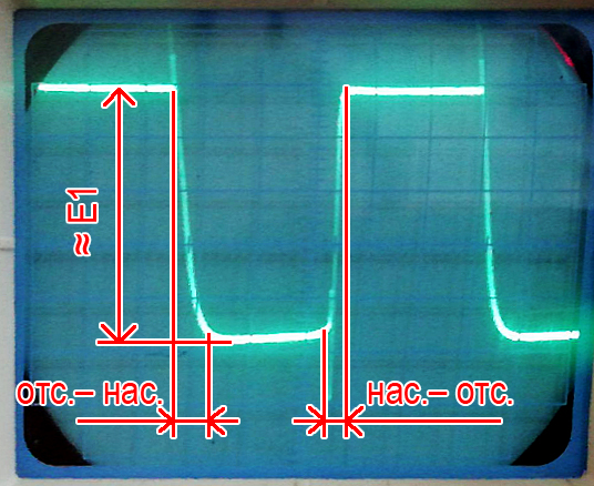 Установите для транзистора режим отсечки: напряжение Е1 = 6 В, ток базы – ноль, при этом ток коллектора должен быть равен нулю, напряжение на коллекторе около 6 В. Подайте с генератора прямоугольный сигнал «меандр» частотой 120...150 кГц, напряжением 2...3 В. Получите на осциллографе выходной сигнал.